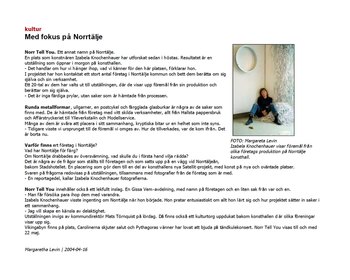 Norr Tell You är ett konstprojekt som berättar en hel del om Norrtälje och oss som bor h är. Det sträcker ut trådar mellan olika arbetsplatser och väcker nyfikenhet på vad andra gör när de är på jobbet. Det är roligt att försöka gissa vilket företag det är som hör ihop med en grej som ser ut som en liten plättlagg. Och vad kan de där små runda pryttlarna vara för nånting?